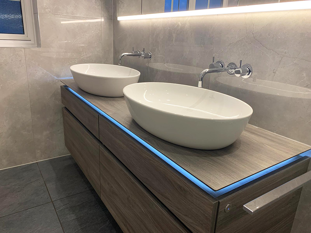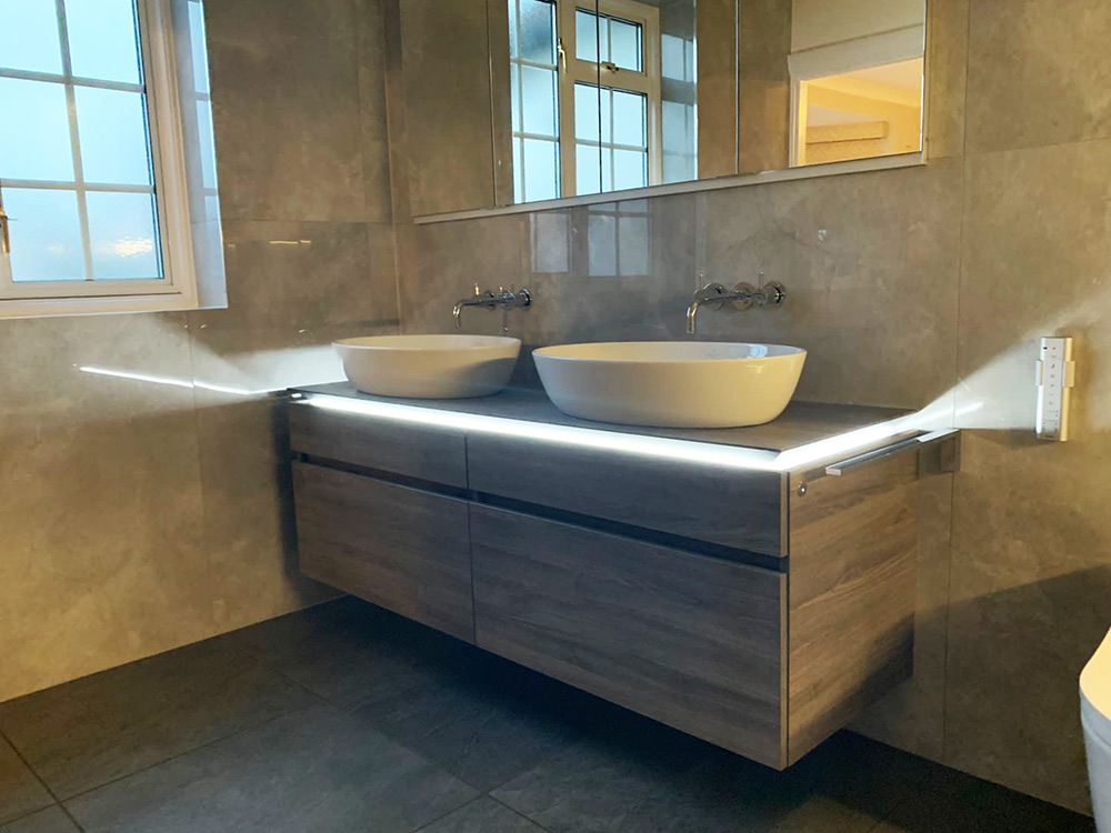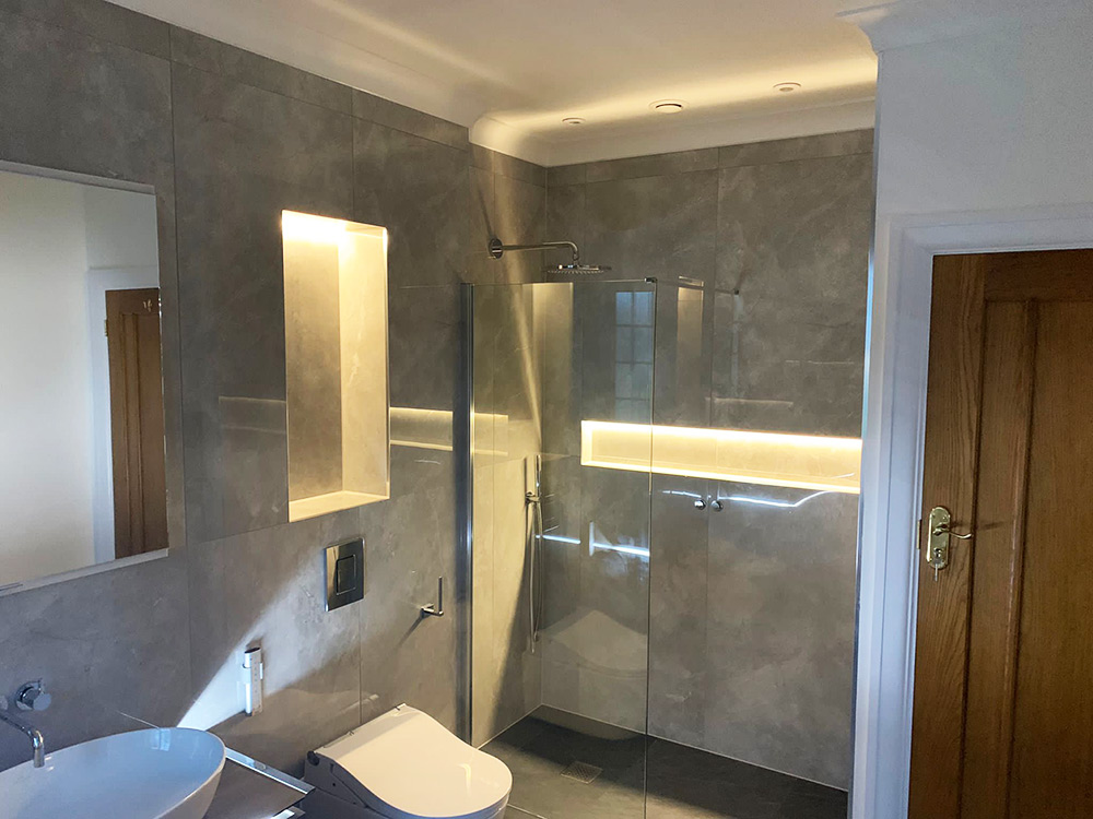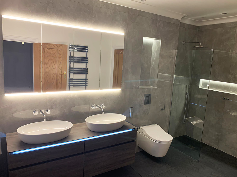 At this detached property in Surrey, we delivered a full electrical installation for a luxury bathroom refurbishment.
